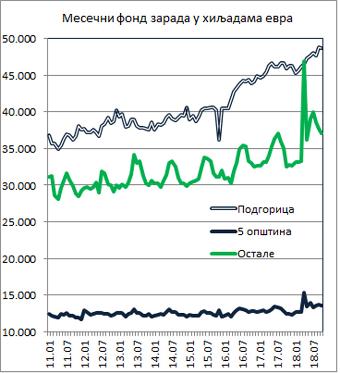 Укупан фонд нето зарада, израчунат као производ просечних зарада и броја запослених, повећан је, од јануара 2011. до октобра 2018, за 19 милиона евра, са 80 на 99 милиона. У овом повећању Подгорица је имала пораст од 11,9 милиона, остале општине без Подгорице и пет одабраних за 6 милиона, а пет општина са српском већином за 1,1 милиона евра.