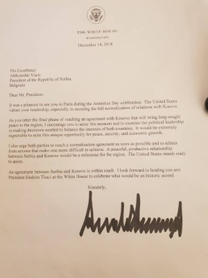 Амерички председник упутио је писмо 14. децембра, а на тај дан је, иначе, усвојен закон о трансформацији Безбедносних снага Косова у војску. Писмо од Трампа добио је и косовски председник Хашим Тачи.