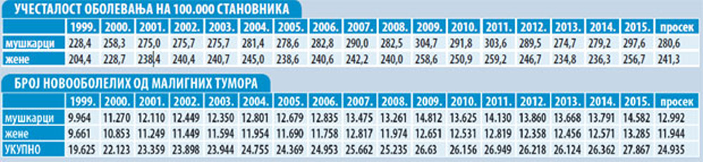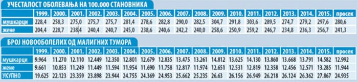 Током тог периода дошло је и до кумулативног, укупног пораста стопа инциденције свих малигних тумора – код мушкараца за 30,3 одсто, што значи да се карциноми који су се 1999. године јављали код 228,4 од 100,000 мушкараца сада откривају код до 297,6 од 100,000. То је повећање за 1,8 одсто годишње! Код жена је учесталост малигних тумора за 16 година повећана за 25,6 одсто, односно са 204,4 случаја на 100.000 жена на до 256,7. То је повећање 1,5 одсто годишње!