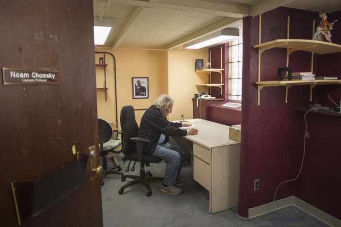 Након 60 година подучавања на Масачусетском институту за технологију (МИТ), професор је дошао живети на граници пустиње Сонора. У Туксону, на преко 4.000 километара од Бостона, пронашао је нови дом на Одсеку за лингвистику на Универзитету у Аризони. То је једна од ретких зелених тачака у овом спрженом граду. Јасени, врбе, палме и ораси расту око зграде од црвене цигле из 1904. Унутра по зидовима висе слике насмешених студената, мапе простирања аутохтоних племена, плакати културних догађаја, а на крају једног ходника је соба највећег живог лингвисте.
