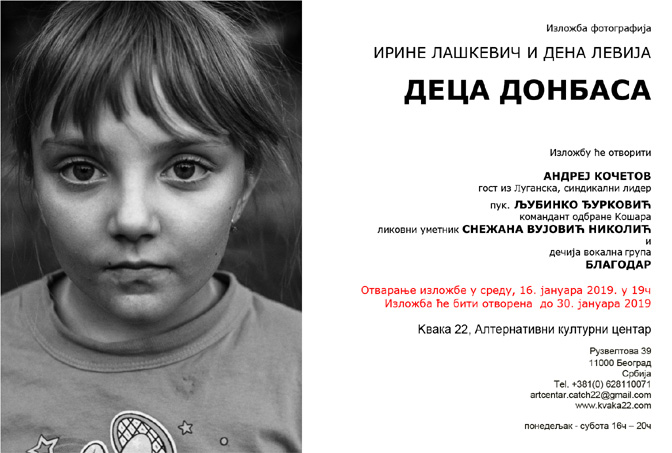 Изложбу фотографија „Деца Донбаса“ Ирине Лашкевич и Дена Левија ће отворити Андреј Кочетов, синдикални лидер из Луганска и пуковник Љубинко Ђурковић, командант одбране Кошара, који је недавно посетио Донбас и дечији вокални ансамб Благодар. У сарадњи са галеријом Квака 22, изложбу је организовала Снежана Вујовић Николић, ликовни уметник.
