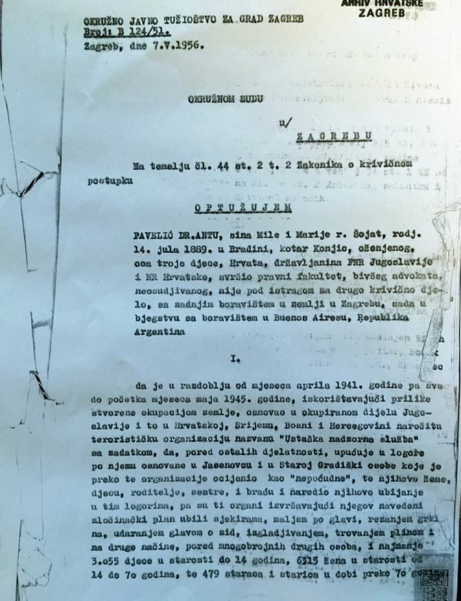У оптужници против Павелића као најтежа инкриминација је наведено да је он „od mjeseca aprila 1941. do početka mjeseca maja 1945., iskorištavajući privremenu okupaciju zemlje, osnovao u okupiranom dijelu Jugoslavije, i to u Hrvatskoj, Srijemu, Banatu i Bosni i Hercegovini, terorističku organizaciju nazvanu ‘Ustaška nadzorna služba’ sa zadatkom da pored ostalih djelatnosti, upućuje u logore osnovane u Jasenovcu i Staroj Gradiški, osobe koje te organizacije ocijene kao ‘nepoćudne’…“ Наведено је да су депортације деце, њихових родитеља и рођака у логоре завршавале њиховом смрћу проузроковане ударцима секира, маљева, ударањем од зид, изгладњавањем, тровањем…
