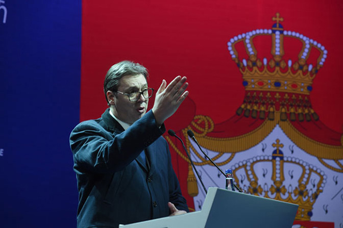 Он је додао да је Србија јака, много јача него што је била, али нам треба мир, требају нам десетине година слободног развоја и напретка, нове фабрике, нове школе, нова позоришта, деца која знају да имају сигурну будућност.