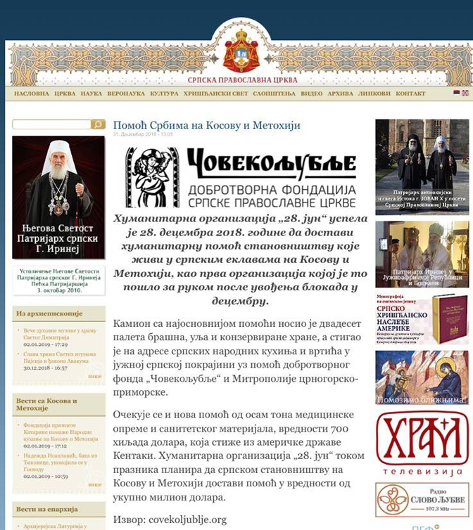 3. У званичној објави „28. јуна“ која се тиче хитне доставе хране народној кухињи и вртићу на Косову и Метохији, у децембру прошле године, јасно је наведено да је достављено око 20 палета хране, изражена је дубока захвалност добротворном фонду Човекољубље, уз чију сарадњу је цео пројекат и реализован. Читав трошак превоза и доставе такође је сносила наша организација.