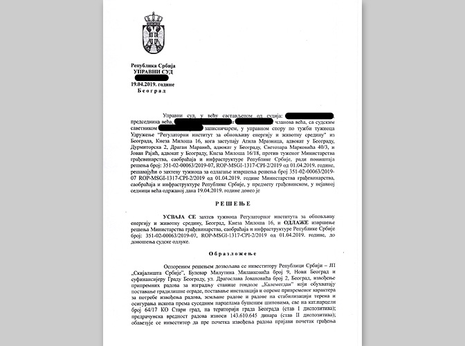 То је јуче у саопштењу навео Регулаторни институт за обновљиве изворе енергије и заштиту животне средине (РЕРИ), који је 17. априла поднео тужбу Управном суду захтевајући да се грађевинска дозвола за извођење припремних радова поништи као незаконита и да се радови хитно зауставе.