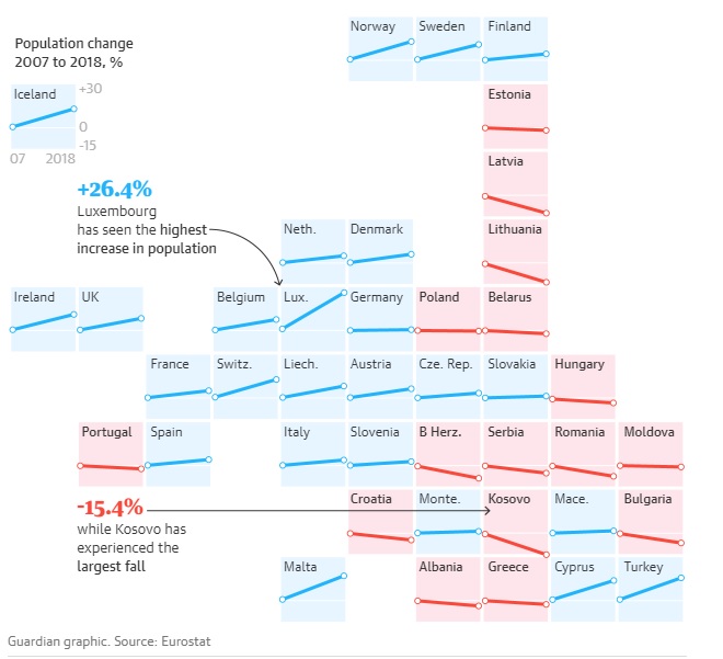 Многе источноевропске државе су доживеле пад броја становника између 2007. и 2018. године