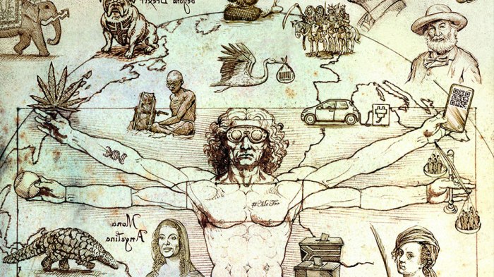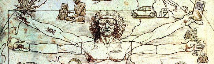 Међутим, на насловници „Економиста“ није Да Винчијев оригинални лик, него модерни масонски роб: он носи наочаре за гледање виртуелне стварности, у рукама држи марихуану, бејзбол лоптицу и смартфон. Порука је јасна: дроге, нове технологије и спортска забава држе савременог глупака у ропству глобалистичких сатаниста. На руци му је тетовиран знак за ДНК завојницу, јер је главни циљ илумината упад у људски ДНК, и новонацистичка еугеника. Ту је и тетоважа за покрет „#MeToo”, који су покренули холивудски либерали, и чији циљ је рат против „сексуалног узнемиравања“, каткад повезан са причом о рушењу традиционалних полних улога и „новим сексуалним поретком“ демаскулинизације.