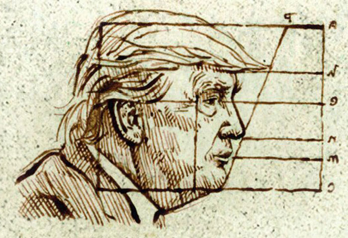 Витрувијански човек држи и кантар на коме петорица претежу четворицу. Реч је о чињеници да је у Врховном суду САД, после Трампове победе, пет конзервативних наспрам четири либералне судије, што се не уклапа у глобалистичку агенду.