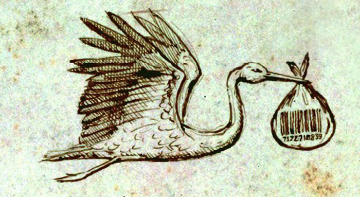 Рода у кљуну носи новорођенче, али обележено бар-кодом. То је, наравно, најава жигосања жигом звери, које треба да почне од беба. Такође, то је и прича о ДНК модификованој деци, коју ће родитељи „наручивати“ тако да имају „најбоље особине“. Бар-код је и ознака трговине. Децом се у наше време тргује више но икад.