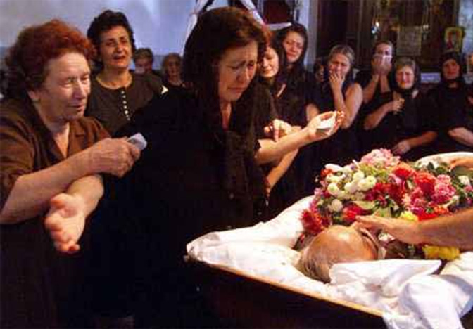 Супруга и родбина оплакују убијеног Драгомира Симића у ораховачкој цркви Успења Пресвете Богородице, у чијој је порти и сахрањен