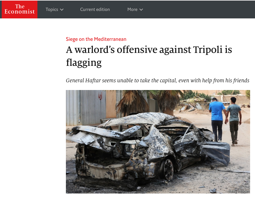 Већина становника Триполија жели владу која је способна да очисти ђубре и оконча изнуде које врше милиције, њихово поткрадање централне банке и бандитске ратове у престоници. („То је као да кротите дивљу мачку у циркусу“, описао је владин званичник управљање Триполијем). Поједини би можда поздравили ред чији је повратак Хафтар обећао. Али његово бомбардовање поткопало је ова надања. Његове китњасте униформе, непотистичко истицање сопствених синова и подршка коју му пружају присталице бившег режима распирују страховања од другог Гадафија.