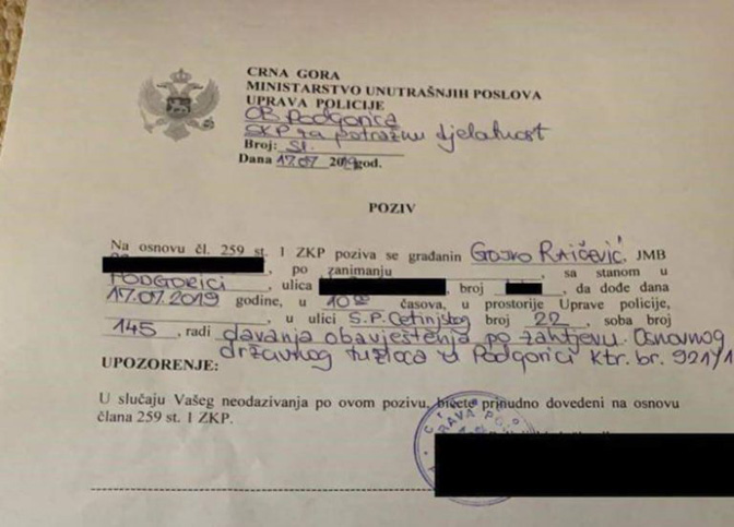 Такође свјестан да разлог за моје позивање на „информативни разговор“ је у чињеници да у континуитету откривам криминалне активности прве фамилије и савјетника предсједника ДПС Мила Ђукановића.