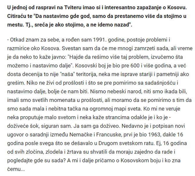 „Ни у једном тренутку нисам рекао да треба предати Косово, већ да треба наћи решење и окренути се будућности. Али добро, увек је добро скренути пажњу са неке друге ствари на Калину издајника“, додао је бивши играч Црвене звезде.