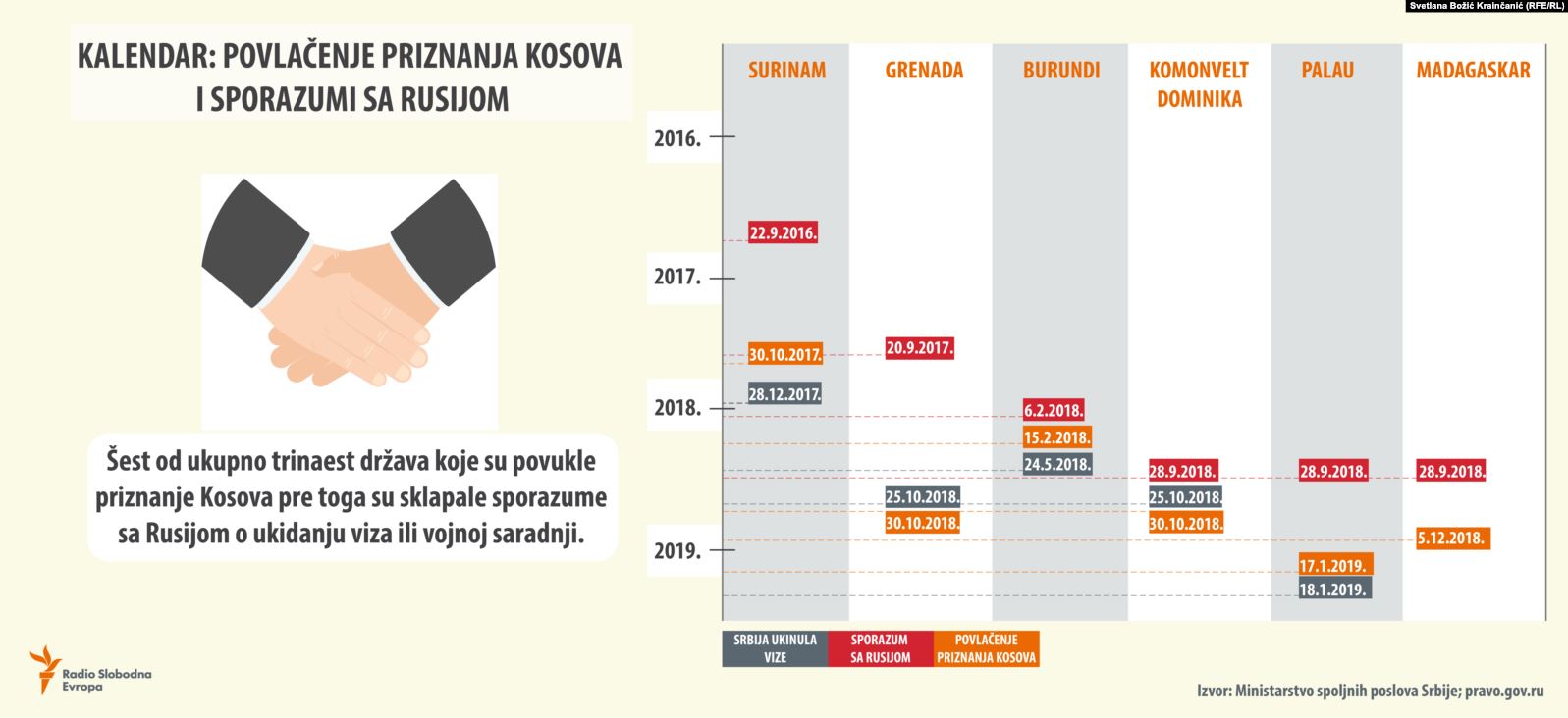 Споразуми са Русијом претходили су одлукама тих држава да повуку признање или привремено суспендују одлуку о повлачењу признања Косова, на шта указују датуми када су споразуми потписани и датуми из нота о повлачењу признања Косова.