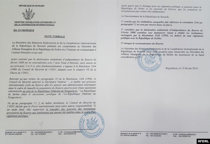 Копија дипломатске ноте о повлачењу признања Косова, коју је Министарство спољних послова Бурундија упутило Министарству спољних послова Србије 15. фебруара 2018.