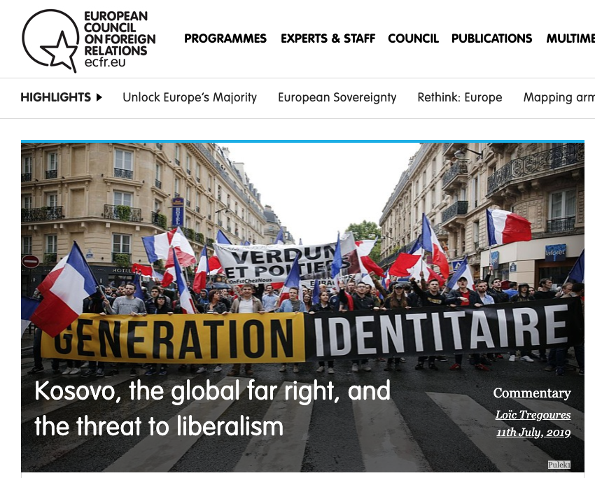 Из електронскog летка (са печатом Концила за инострану политику) писаног руком настављача лика и дела Јозефа Гебелса сазнајемо да је новозеландски терориста био надахнут Радованом Караџићем а косовским Србима мрвице хране се усуђује да носи крајње-екстремно-идентитарски бели десничар. Из тога следи, ео ипсо, политика која укључујући и ”руски наратив”, води ка насиљу према ”илибералима”. Каква црна слика небивалог стања садашње цивилизације. Либерали свих земаља уједините се,,,
