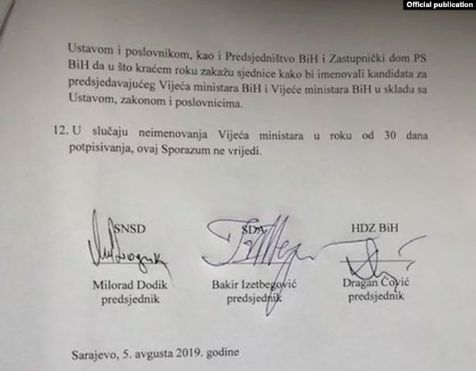 На крају, треба подсјетити да је за ХДЗ у овим преговорима било кључно да добију сагласност за измјену Изборног закона, СДА је поставила као услов НАТО пут, док СНСД није имао других услова сем да засједне у фотеље, што би по њима била гаранција „одбране српских интереса“.