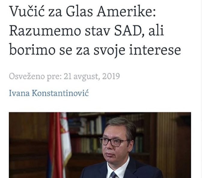 „Можемо да разговарамо о свему само ако је реч о компромису. А за то да Албанци добију све, а Србија да не добије ништа, мој потпис нећете добити никада. У овом тренутку сам председник Србије, можда пронађете неког другог ко ће желети да без икаквог компромиса, следећи само ултиматуме, да то прихвати“, рекао је Вучић у интервјуу за Глас Америке, на питање да ли ће он бити политичар који ће признати Косово.