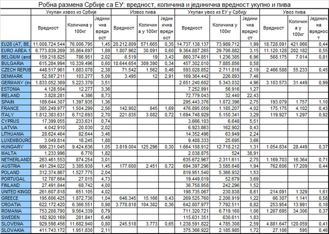 Робна размена Србије са ЕУ и увоз и извоз пива: вредност, количина и јединична вредност (Табела: Макроекономија)