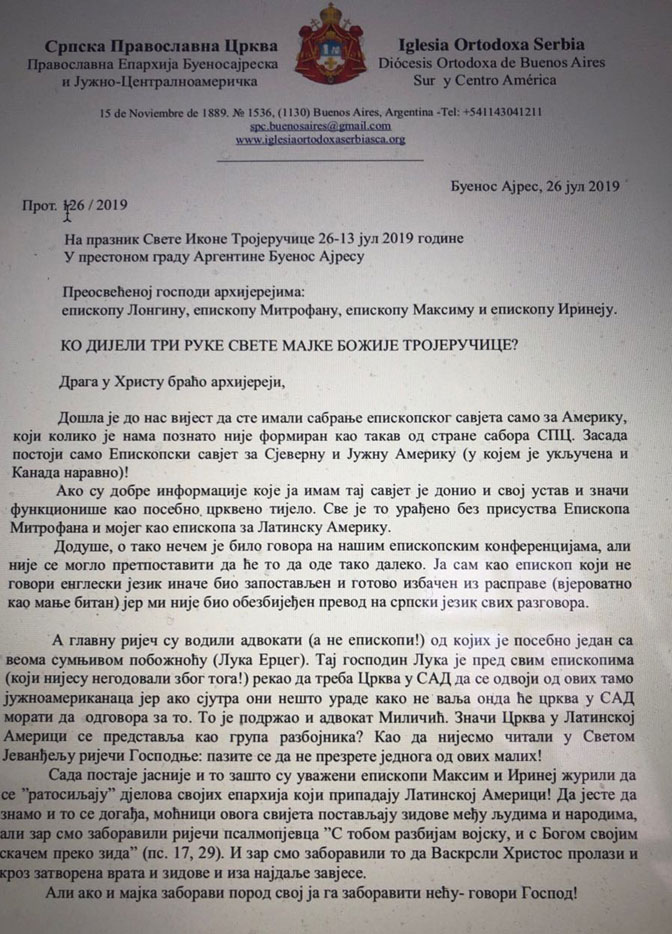 Оптужбе које је из друге руке изнио Поповић на први поглед су звучале острашћено и претјерано, док нису у својој суштини потврђене са далеко вишег и легитимнијег мјеста: на блажи начин их износи и јужноамерички епископ Кирило у свом писму од 26. јула. Епископ Кирило, један од петорице чланова Епископског савјета за Сјеверну и Јужну Америку, обраћа се осталој четворици, епископима Лонгину, Митрофану, Иринеју и Максиму, и кори их што се мимо његовог знања и учешћа донијела одлука да се епархије у САД-у правно одвоје од његове, Јужно-средње-америчке, и Канадске. Ни епископ Канадски Митрофан, коме се такође обраћа епископ Кирило, није учествовао на Сабору у Чикагу.