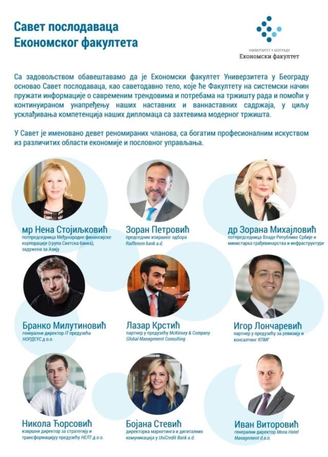 Савет је основан као саветодавно тело које ће факултету на системски начин пружати информације о савременим трендовима и потребама на тржишту рада и помоћи у континуираном унапређену наставних и ваннаставних садржаја, саопштио је Економски факултет у Београду.