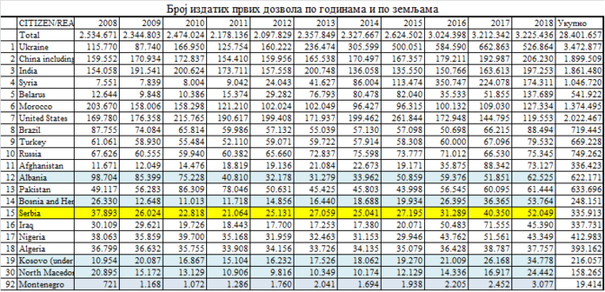 Како било, Србија (без података за КиМ) је са 52.049 издатих дозвола била на 15 месту, упоредива са Пакистаном, БиХ, Ираком и Нигеријом. Рекло би се у правом друштву.