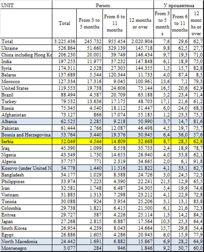Временска дужина дозвола за становнике Србије готово да је идентична просечним за све који траже дозволу за боравак у ЕУ. Овај податак нам не пружа никакву додатну информацију, сем да видимо специфичности других земаља. На пример, становници Белорусије имају убедљиво најмањи удео дозвола издатих на више од годину дана, а становници Алжира добијају релативно највише ових најдужих дозвола.