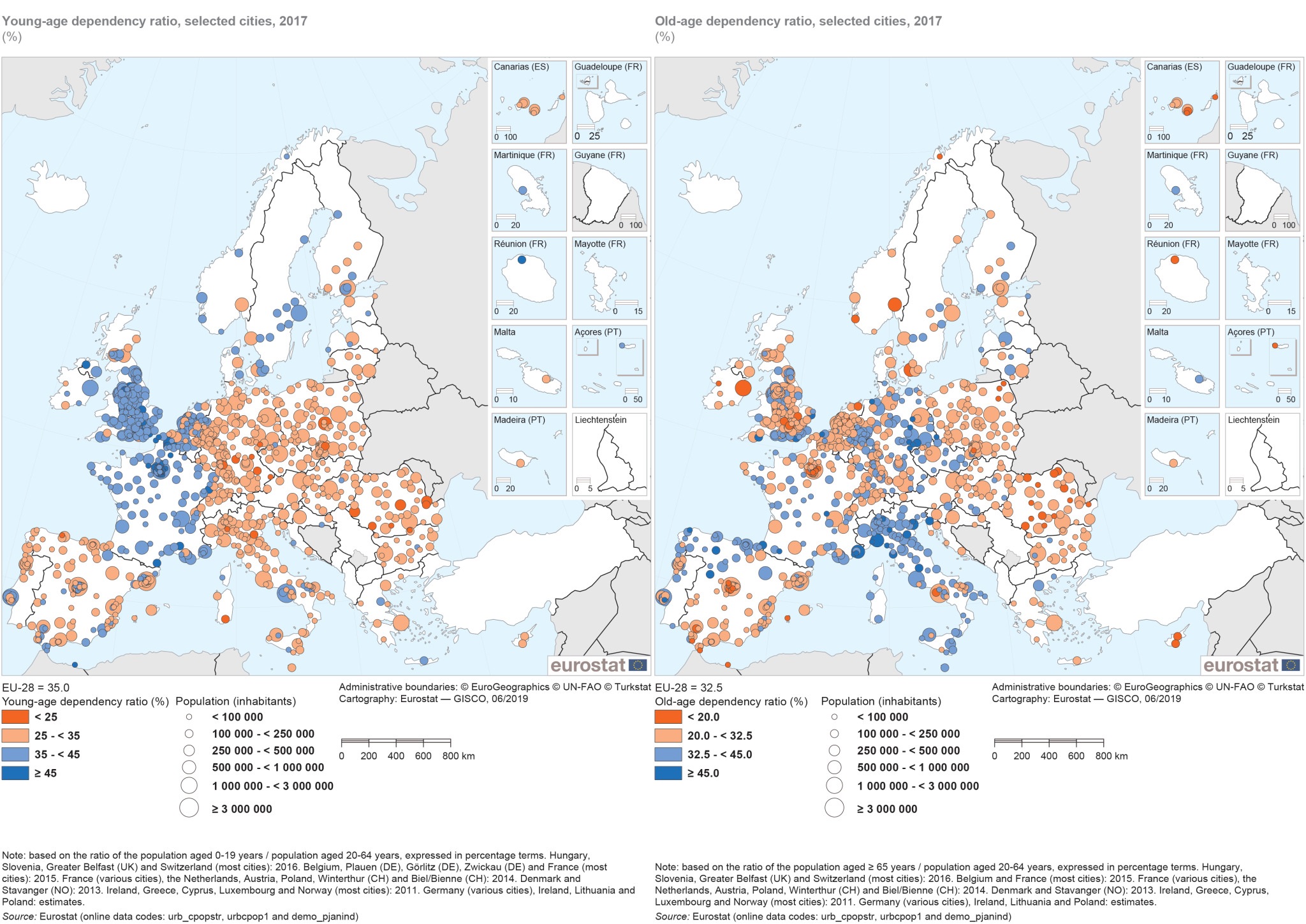 Однос младих према радно-активним био је 35% у 2017. Однос старе зависности био је мало нижи – 33%. Према саопштењу (подаци се односе на 2017. мада има и података за 2018, а за Португалију и за 2019) најмлађи главни град у ЕУ био је Брисел са односом преко 40%, блиско праћен Паризом и Бриселом (39%), док је Лисабон имао највећи однос старих (преко 41%), испред Рима (36%) и Валете (34%).