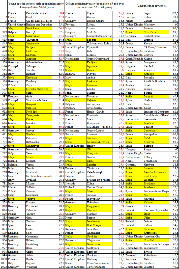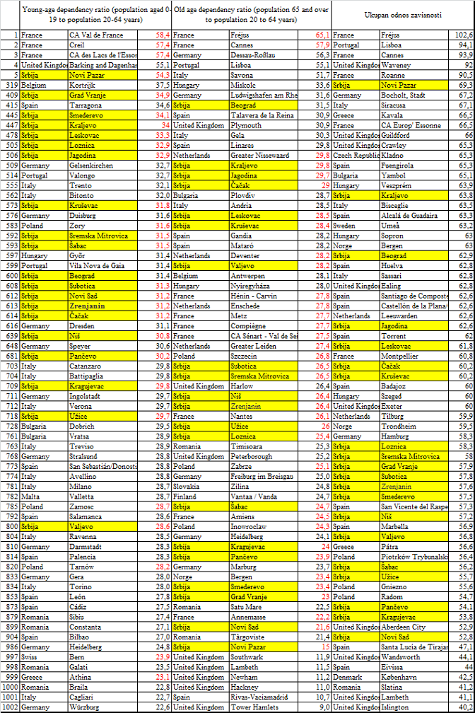 Нови Пазар је у европском врху према односу младих према радно-активнима (54,3:100), а у првој половини табеле, тек од 409 места, су још и Врање, Смедерево, Краљево и Лесковац. Већина српских градова је између 505 места (Лозница) и 614 (Чачак). Најлошије је рангирано Ваљево на 800. месту. Од пописа из 2011. сви градови у Србији су се на овој листи спустили наниже.