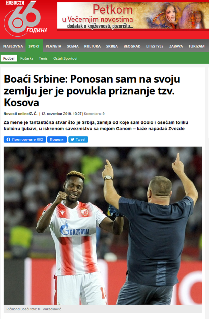 Гана, како је истакао задовољни Ивица Дачић, од свих држава које су досад повукле признање Косова има највише становника, а посебно је згодно испало што је и један од најбољих играча најпопуларнијег српског клуба, Боаћи, прави правцати Ганац, и који је искористио овај одлуку своје Владе да изјави како је веома срећан због тога што је она на српској страни.