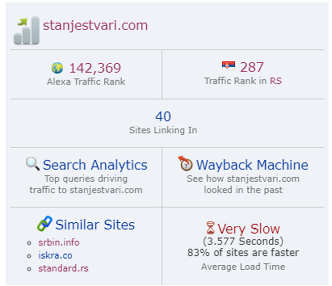 Успех је тим већи што је ваш и наш „гаражно-герилски“ (да не кажемо „брвнарско-ускочки“) пројекат тренутно на 287. месту, а рангирани нису само српски него сви сајтови који се посећују у Србији (прва три места заузимају Гугл, Јутјуб и Фејсбук).