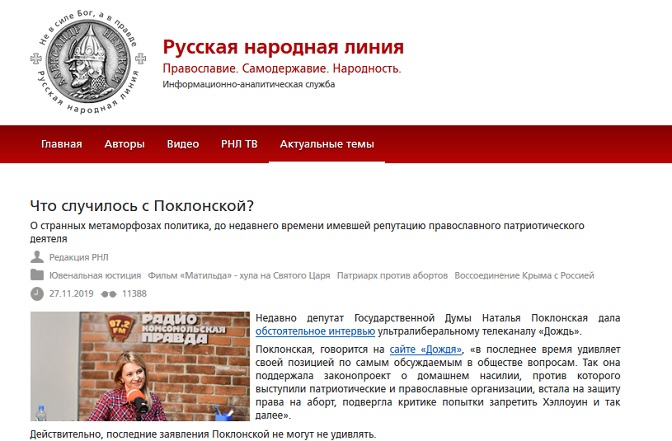 Посрбљено: “ Поред тога, Наталија Поклонска не само што је почела да дела у нескладу са православним народом, него је и одлучила да се либералима покаје за своје грешке…“