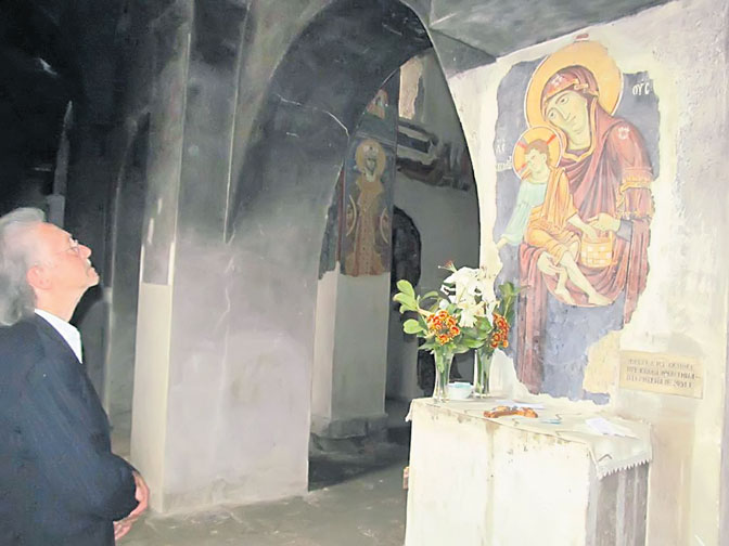Петер Хандке пред фреском у Богородици Љевишкој (Фото: Јована Баљошевић)