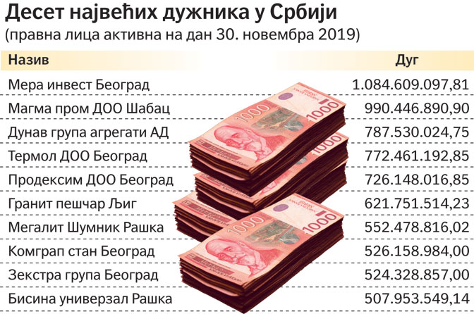 Други је „Магма пром” Шабац, с дугом од 990.446.890,90 динара, који ће такође бити принудно наплаћен из новчаних средстава, трећи је „Дунав група” АД Нови Сад, с дугом од 787.530.024,75 динара. Према подацима АПР-а, власник ове компаније је „Дунав група” ДОО, чији је директор познати бизнисмен Душан Боровица. Међу дужницима је и „Термол” ДОО Београд, који дугује 772.461.192,85, пети „Продексим” ДОО Београд са дугом од 726.148.016,85 динара, а следи Грађевинско предузеће „Гранит пешчар” из Љига, које је дужно 621.751.514,23 динара. На списку су и фирма „Мегалит-Шумник” из Рашке (552.478.816,02 динара), као и Холдинг корпорација „Комграп” АД Београд (526.158.984 динара). „Зекстра група” Београд, која је годинама била у власништву Драгана Ђурића, девета је на списку највећих пореских дужника, са дугом од 524.328.857 динара, а десети је „Бизнис универзал” Рашка, чији дуг износи 507.953.549,14 динара.
