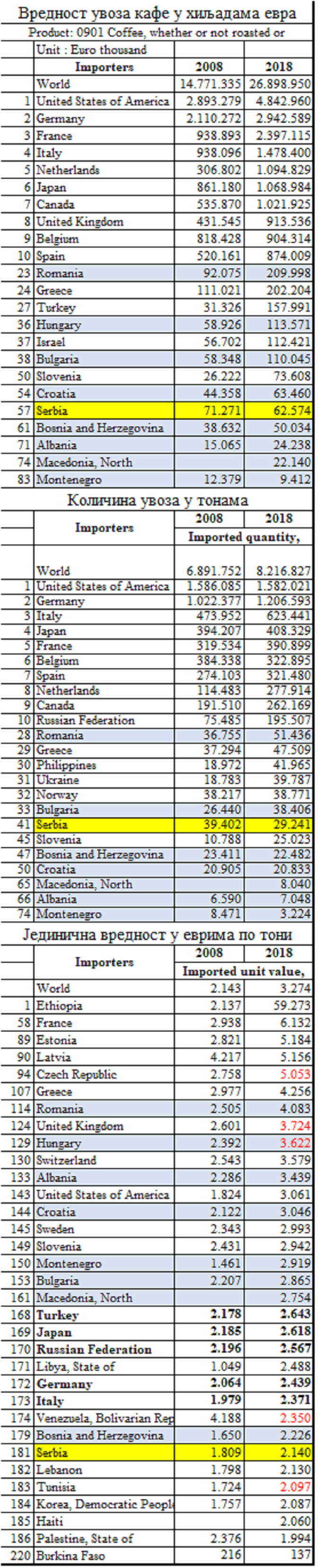Купујемо кафу по најнижој цени у односу на земље које нас окружују и то је 181. од 220 просечних увозних цена, па би и ово требало да буде аргумент о њеном ниском квалитету. Међутим, то је само за 12,3% нижа цена од немачке и за 9,7% мања од италијанске, а ту су нам по цени блиски и Русија, Јапан и Турска, што пре наводи на чињеницу да се код нас, и у овим земљама, претежно увози сирова кафа док се у нашим суседима (сем БиХ) пију и фенси прерађевине из Немачке и Италије. И то се лако може потврдити из детаљних увозних података ових земаља: купују ли кафу из земаља произвођача или земаља прерађивача.