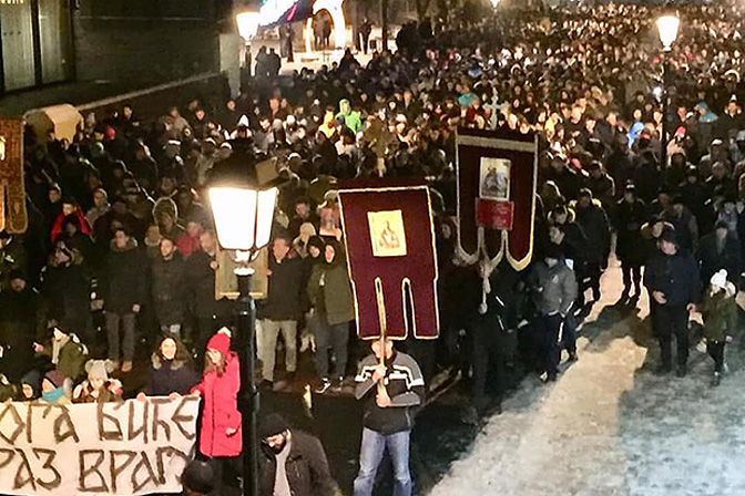 Око десет хиљада Никшићана окупило се у литији од Саборног храма Светог Василија Острошког до Трга Слободе. Према проценама, молитвено сабрање у одбрану свете вере православне и светиња окупио је синоћ преко десет хиљада грађана Никшића. На Тргу слободе речима надахнуте пастирске беседе обратио се свештеник Миодраг Тодоровић.