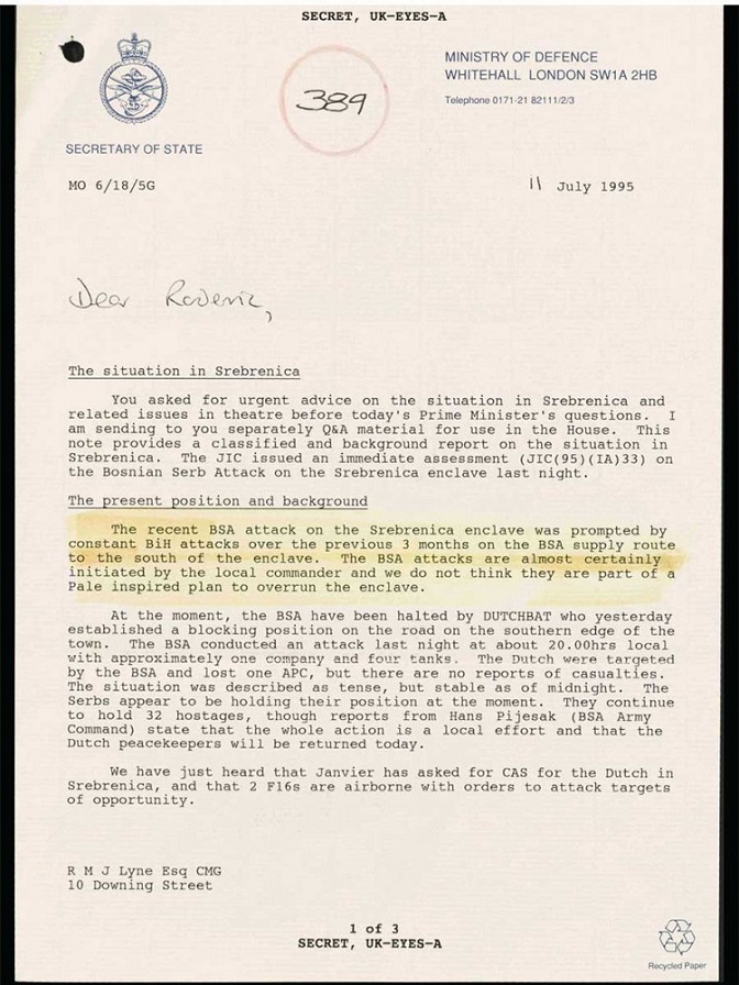Као што се с времена на време догађа, западни фактори су опет обелоданили одређене податке о догађајима на подручју Сребренице у јулу 1995, који су се до недавно налазили под ембаргом и стога нису били доступни јавности. Извор тих података је Министарство одбране Велике Британије. У групи докумената са којих је најзад скинута ознака тајности, налазе се врло занимљиве процене и извештаји који за правилно тумачење сребреничких догађаја попримају још већи значај када се укрсте са другим сазнањима и већ познатим документима. Докуменат који је изазвао највећу пажњу српских медија је допис функционера министарства одбране упућен Родерику Лину, приватном секретару тадашњег премијера Џона Мејџора, под датумом од 11. јула 1995. Сврха дописа је да Мејџору преко Лина саопшти најбитније податке о дешавањима на подручју Сребренице да би се премијер у парламенту боље снашао када му се буду постављала питања на ту тему.