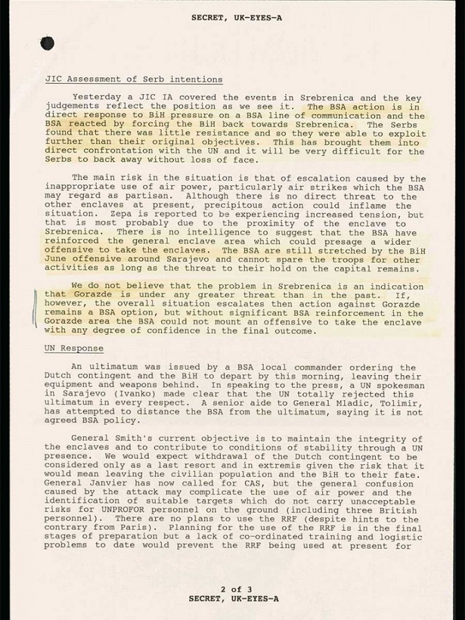 Пре свега, и по срж сребреничке приче најглавније, извештач из британског министарства одбране, под датумом од 11. јула 1995, хладно саопштава свом премијеру да у том тренутку службе Велике Британије не располажу било каквим сазнањима која би упућивала на закључак да Војска Републике Српске намерава да сребреничку енклаву освоји и стави под своју контролу. Овај податак је од изузетног значаја због импликација које из тога проистичу.