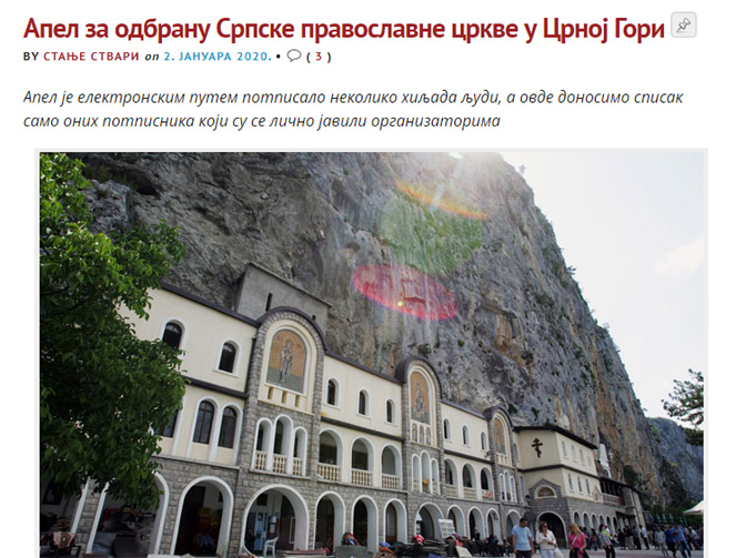 „Апел за одбрану Српске православне цркве у Црној Гори“ покренут поводом „Закона о слободи вјероисповјести“ и, како се у „Апелу“ наглашава, покушаја да се у Црној Гори национализује имовина Српске православне цркве и тиме постепено поништи постојање Српске цркве и српског народа, до сада је потписао велики број епископа, академика, професора универзитета, научних радника, писаца, редитеља, глумаца, музичара, новинара и грађана из Црне Горе, Србије, Републике Српске, Македоније, Хрватске и расејања.