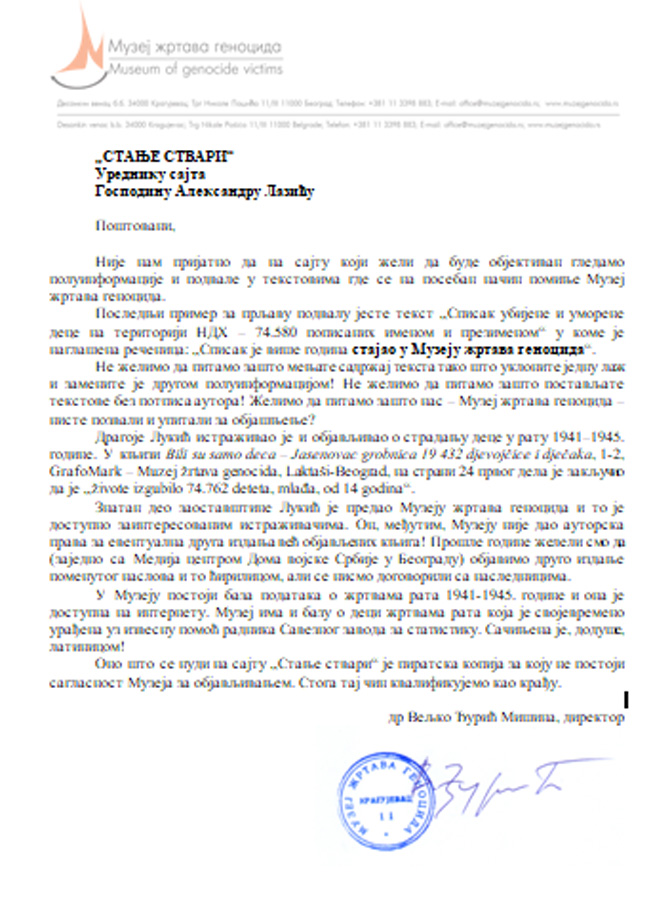 Oно што се нуди на сајту „Стање ствари“ је пиратска копија за коју не постоји сагласност Музеја за објављивањем. Стога тај чин квалификујемо као крађу „СТАЊЕ СТВАРИ“ Уреднику сајта Господину Александру Лазићу Поштовани, Није нам пријатно да на сајту који … Настави са читањем Реакција Музеја жртава геноцида на текст „Списак убијене и уморене деце на територији НДХ – 74.580 пописаних именом и презименом“