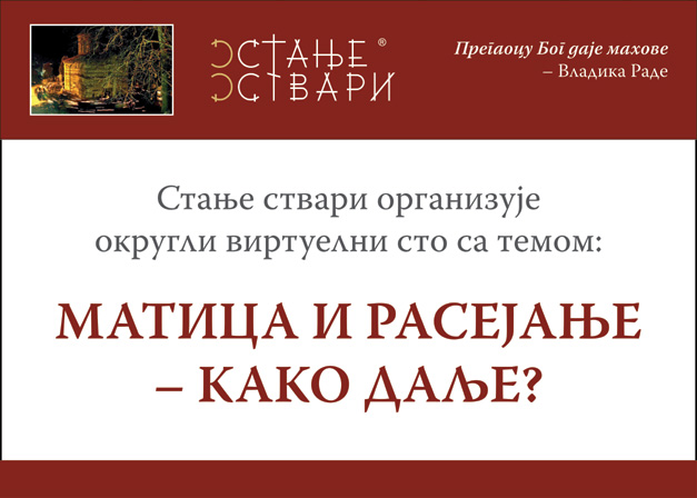 После успешно одржаног састанка СТАЊЕ СТВАРИ УЖИВО 2 на тему „Матица и расејање – како повратити изгубљено поверење“, одлучили смо да покренемо други округли сто (први је био „Српска култура сећања и Јасеновац – изазови и одговори“) на тему „Матица и расејање – како даље“.
