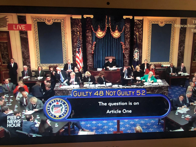 Сенатори су јуче гласали скоро потпуно према партијској припадности у вези са оптужбом за злоупотребу положаја (52:48) и потпуно према партијској припадности у вези са оптужбом која се тиче опструкције Конгреса (53:47), преноси Глас Америке.