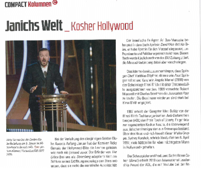 Музичка легенда Френк Запа рекао је једном да влада иде руку под руку с војно-индустријским комплексом. У складу с тим би се, према Венити феру, могло рећи да Холивуд иде руку под руку с Кошер ностром. О том се досад није смело говорити. Џервејз је, међутим, прекинуо омерту. За то је требало храбрости. Одмах на почетку свог говора рекао је да је то његов последњи наступ. Надајмо се само на додели Златног глобуса.