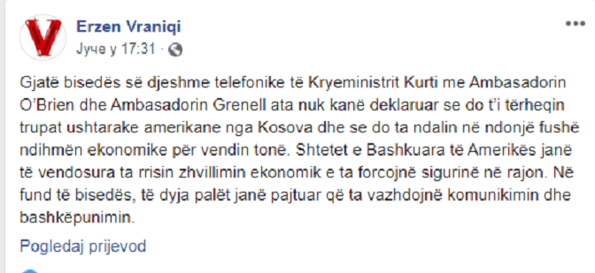 „Током јучерашњег телефонског разговора премијера Куртија, амбасадора О’Брајена и амбасадора Гренела, (они) нису изјавили да ће повући америчке трупе са Косова и зауставити економску помоћ нашој земљи у било којој области. Сједињене Америчке Државе посвећене су јачању економског развоја и безбедности у региону. На крају разговора обе стране су се сложиле да наставе комуникацију и сарадњу“, преко Фејсбука поручио је јуче Ерзен Вранићи.
