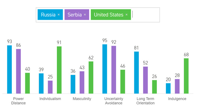 Поређења ради, Сједињене Америчке Државе у овој категорији имају скор од 40, што значи да представници њихове културе не прихватају тако лако хијерархијске разлике. Мање моћни чланови друштва у држави са таквим карактеристикама желе и очекују да се њихов глас чује. У Русији, пак, дистанца између власти и просечног човека још је већа него у Србији, јер резултат ту износи 93 посто, а у Кини је једва мало нижи него у Србији, и тамо износи 80. Разумљиво је да тај скор у ауторитативним срединама још виши. У Саудијској Арабији, рецимо, он износи 95 посто.