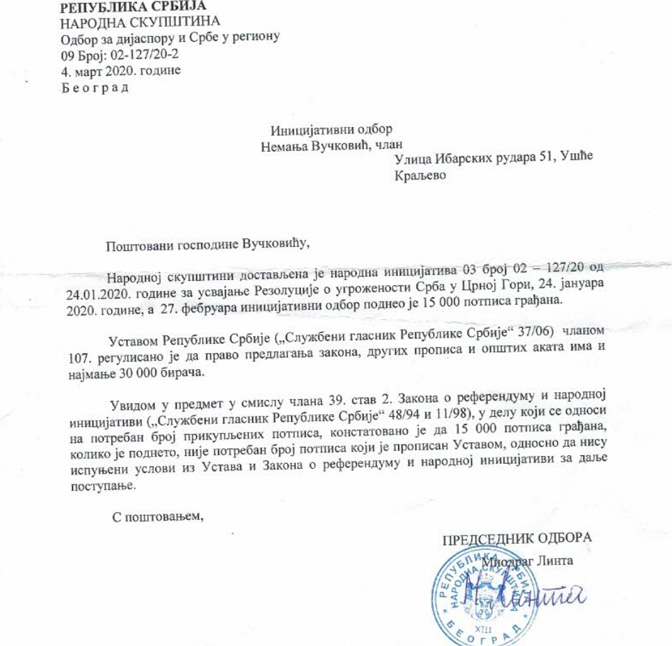Дана 27. фебруара студенти Универзитета у Београду и студенти Правног факултета Универзитета у Београду предали су Народној скупштини Републике Србије 15.000 потписа грађана, као део Народне иницијативе за усвајање Резолуције о угрожености Срба у Црној Гори. Почетком марта стигло је писмо на адресу Немање Вучковића, председника Студентског клуба Правног факултета, како „услови из Устава и Закона о референдуму и народној иницијативи” нису испуњени, због недовољног броја потписа грађана – потребно је 30.000 потписа за даље поступање и наставак процедуре. Писмо је потписао народни посланик Миодраг Линта, председник скупштинског Одбора за дијаспору и Србе из региона.