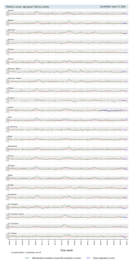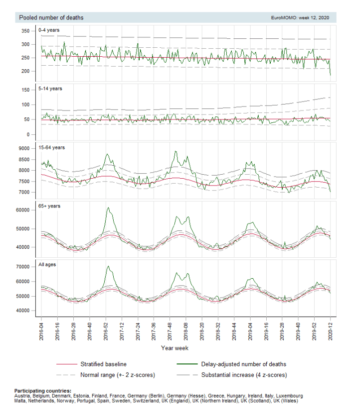 Прикупљене процене о смртности од свих узрока показују у целини нормално очекиване разине у земљама из којих су подаци прикупљени, уз приметно повећану смртност у Италији.