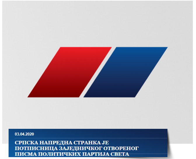 Српска напредна странка је, уз Комунистичку партију Кине и бројне странке широм света, потписница Писма политичких партија света о ближој сарадњи у борби против вируса COVID-19