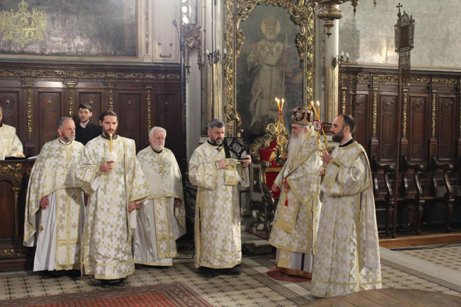 Његово Преосвештенство Епископ новосадски и бачки г. Иринеј служио је свету архијерејску Литургију на празник Уласка Господа Исуса Христа у Јерусалим, 12. априла 2020. године, у Светогеоргијевском храму у Новом Саду. Владици Иринеју су саслуживали: Његово Преосвештенство Епископ мохачки г. Исихије, свештеници и ђакони Саборног храма.