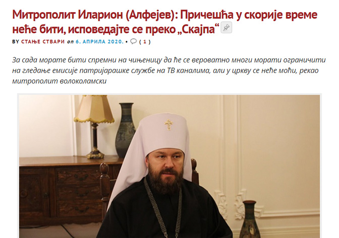 Уопште изазива чуђење што посебно скандалозне изјаве митрополит Иларион даје током ширења корона вируса. До сада су многи били убеђени да је код нас прописано причешћивање једнократним кашичицама, те да се тако ради у храмовима, мада се ништа слично не може наћи у службеном упутству Синода – управо то је митрополит Иларион рекао у једном интервјуу! Још једна његова екстравагантна мисао, она о исповести преко скајпа, такође је пренета као да је наводно „усвојена од РПЦ.“ Претпостављам да је због таквих скандалозних „новина“ В. Р. Легојда[2] био принуђен да да изјаву, да „службена позиција Руске православне Цркве по свим питањима, која се тичу реакције Цркве на ситуацију са корона вирусом, проистиче непосредно од Свјатејшег Патријарха или Радне групе…. Свако друго иступање – представља лично мишљење.“
